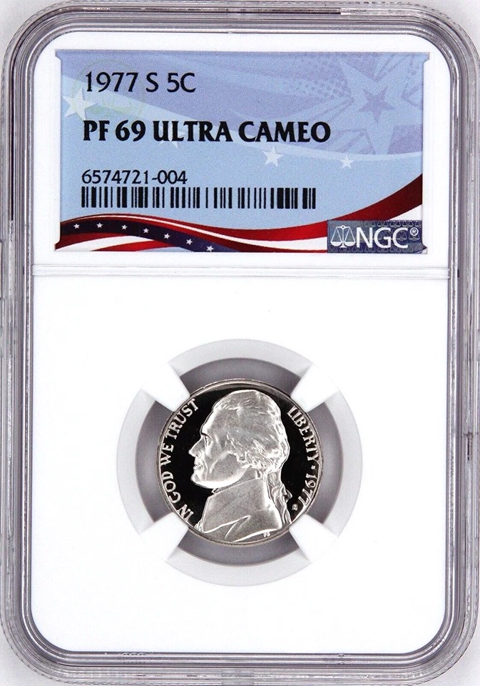 1977-S Proof Jefferson Nickel, Graded PF69 Cameo NGC * OSR Sales Patriotic Label