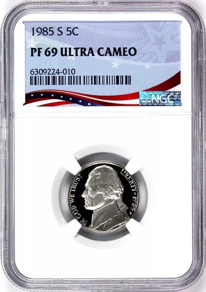 1985-S Proof Jefferson Nickel, Graded PF69UC NGC * OSR Sales Patriotic Label quantity
