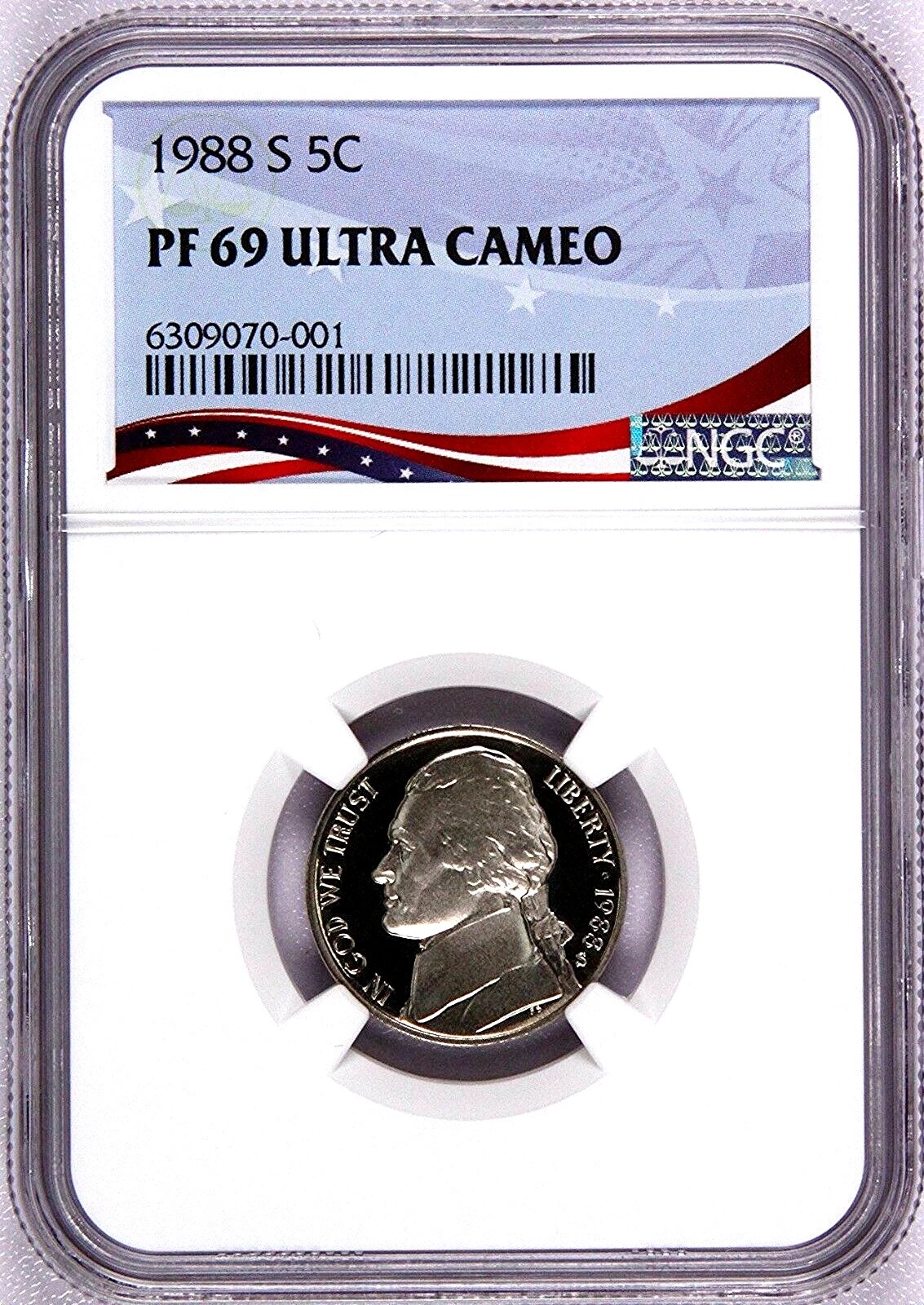 1988-S Proof Jefferson Nickel, Graded PF69UC NGC * OSR Sales Patriotic Label quantity