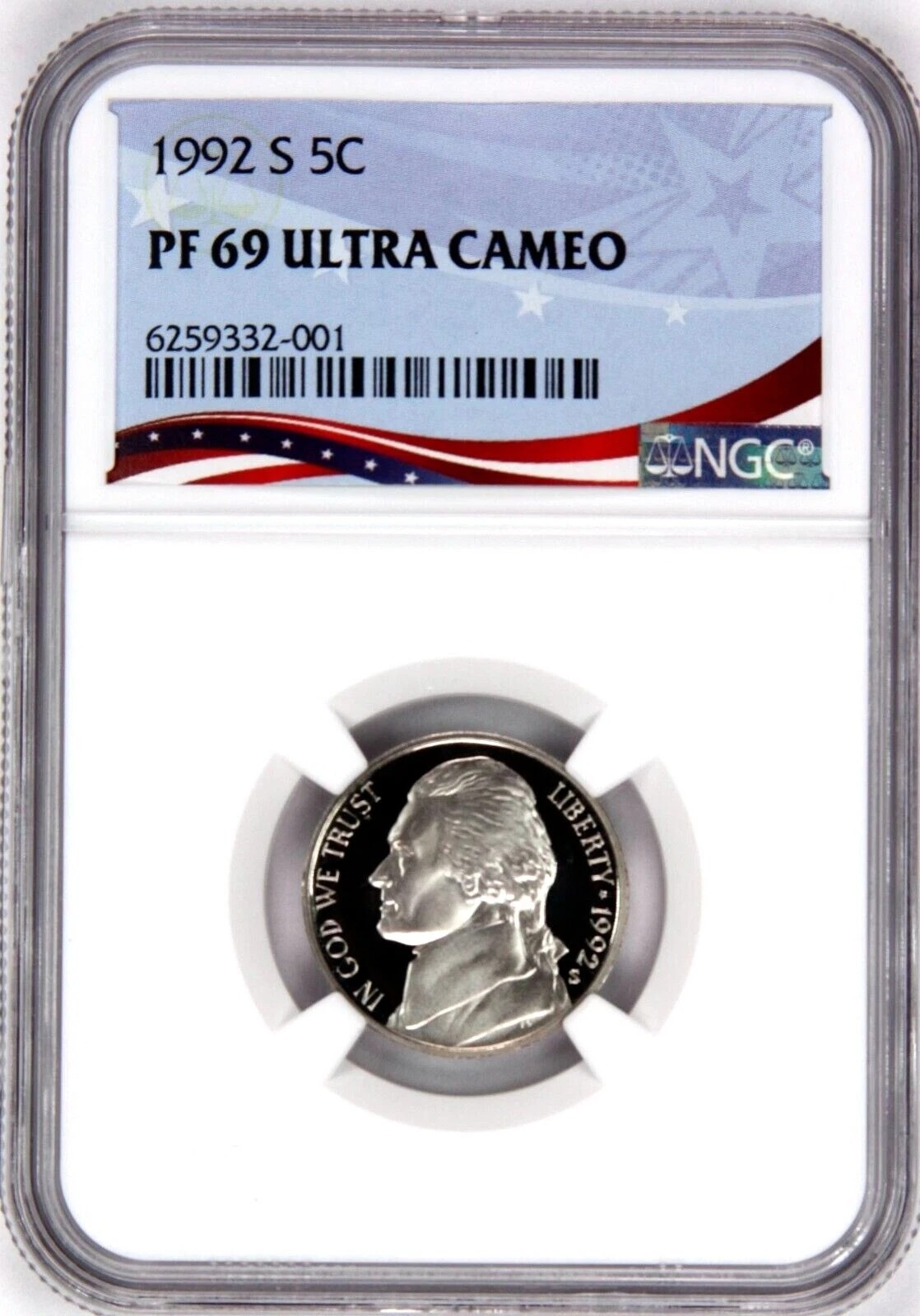 / 1992-S Proof Jefferson Nickel, Graded PF69UC NGC * OSR Sales Patriotic Label