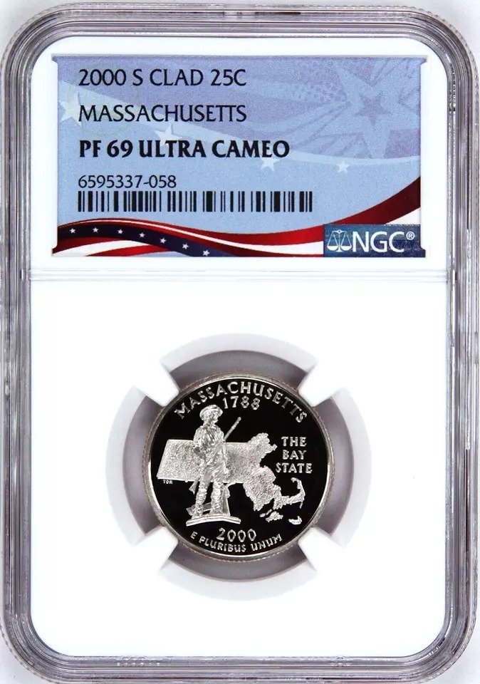 2000-S Proof State Quarter, Massachusetts, PF69 Ultra Cameo, Patriotic Label