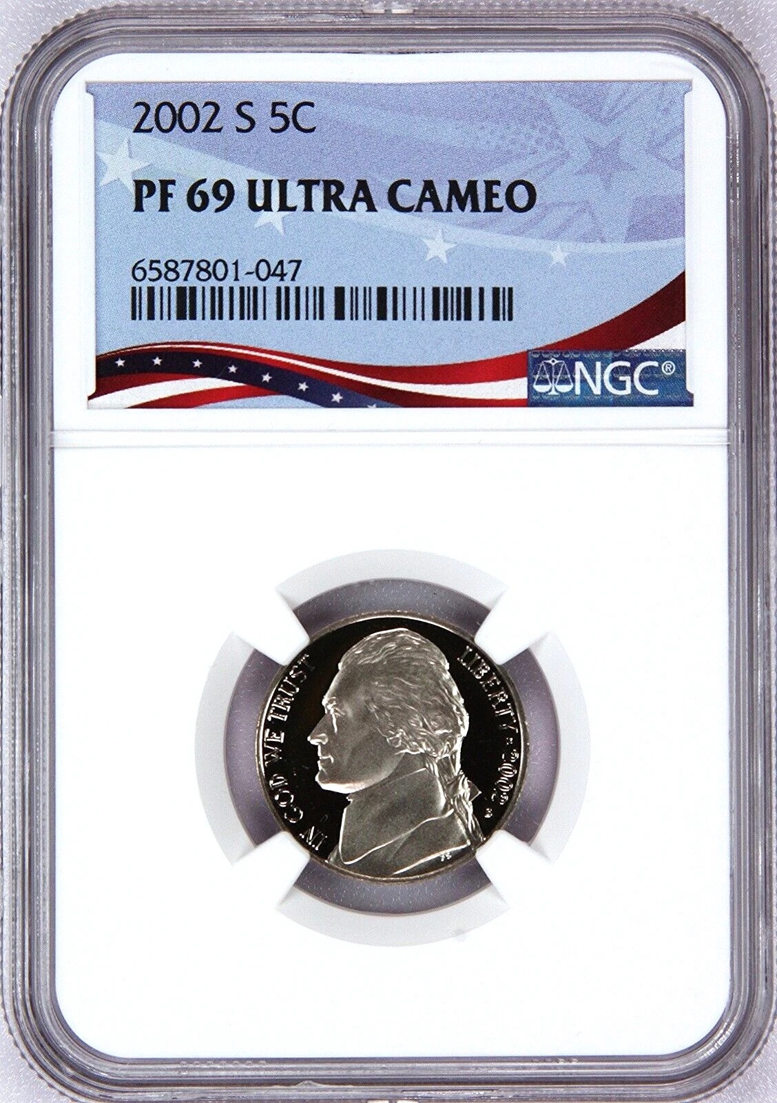/ 2002-S Proof Jefferson Nickel, Graded PF69UC NGC * OSR Sales Patriotic Label