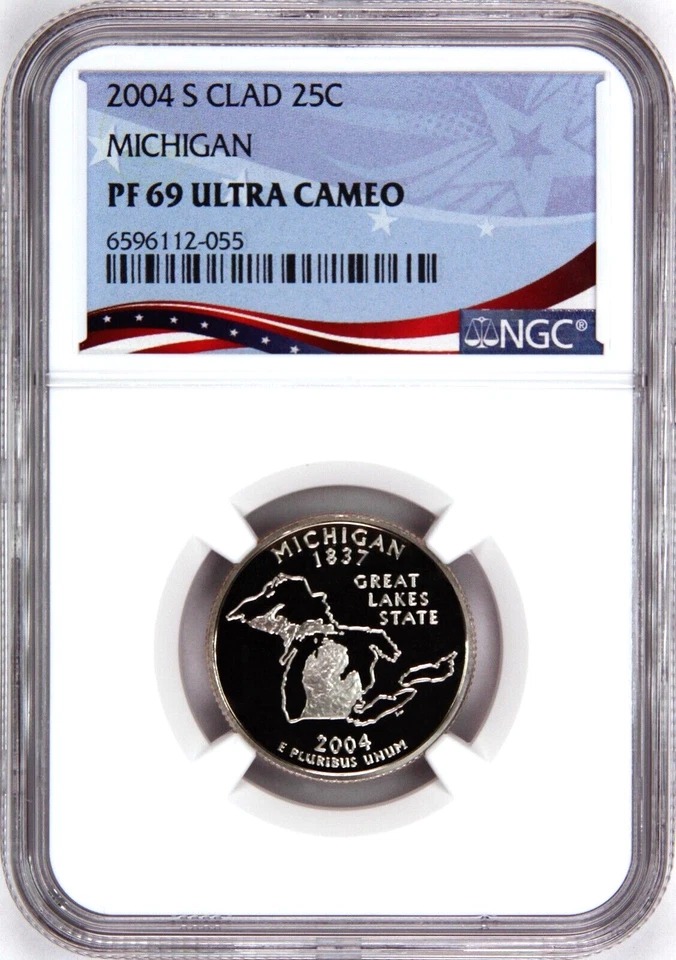 2004-S Proof State Quarter, Michigan, PF69 Ultra Cameo NGC, Patriotic Label quantity