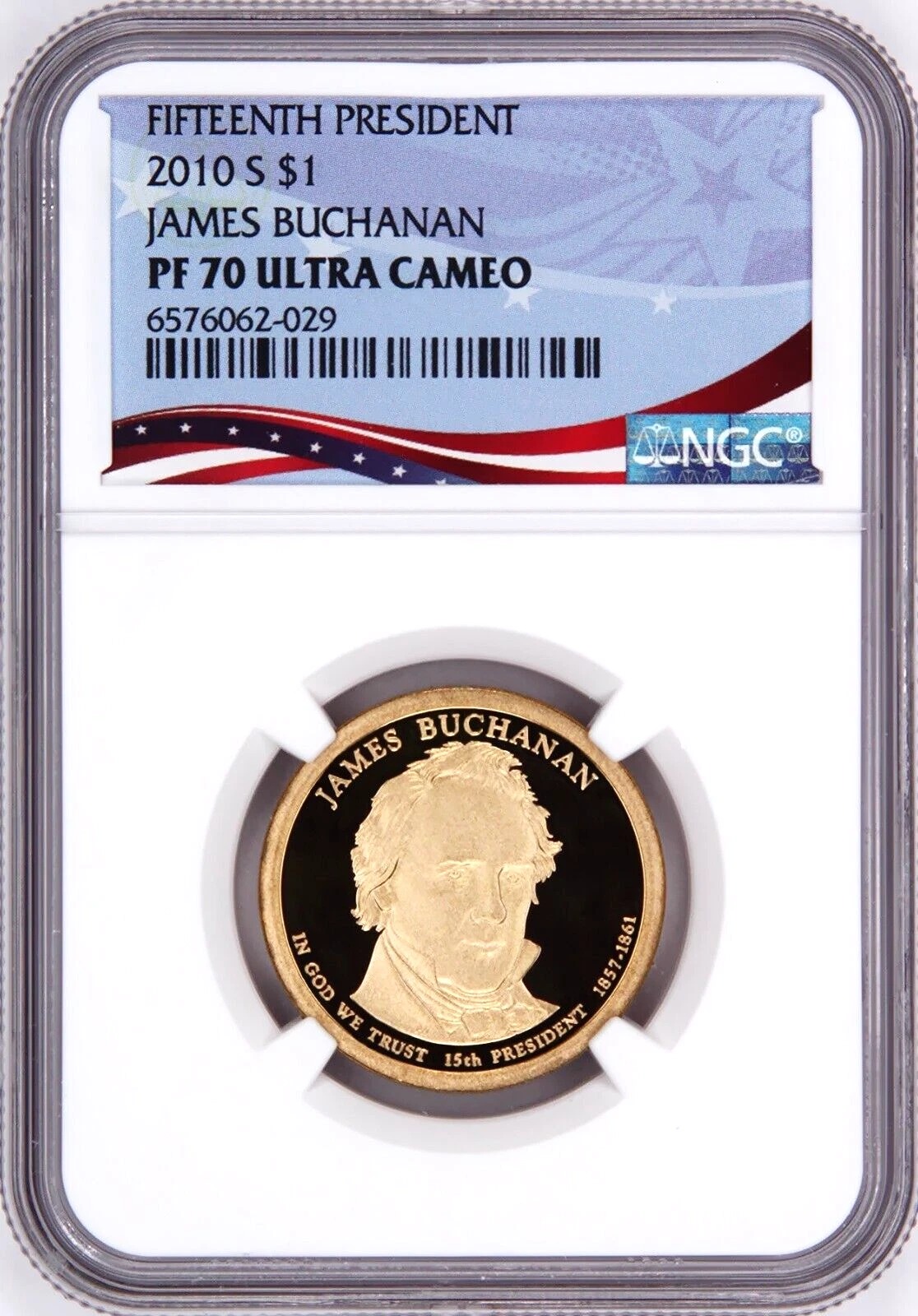 / 2010 S, $1 James Buchanan, Graded PF 70 Ultra Cameo by NGC * Patriotic Label